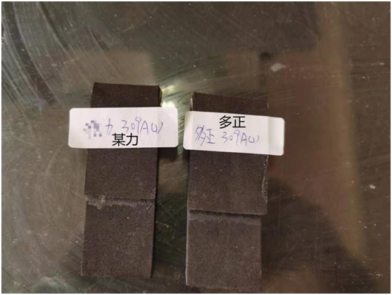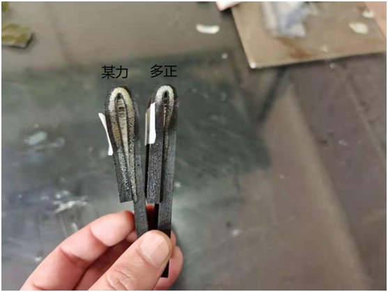 ※使用5mm厚PVC進(jìn)行耐高溫測(cè)試(60℃×30分鐘),某力的耐熱性稍有不足,材料粘結(jié)面拉絲空隙明顯;多正的耐熱性相對(duì)比較高,材料彈性緊密粘結(jié)。
