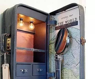 ▲你有閑置破舊的旅行箱嗎?別把它們?nèi)栽诮锹淅?,讓它們發(fā)揮余熱吧。看這個梳妝柜就是用旅行箱改造而成的,不僅有隔板,小抽屜,鏡子,還有照明和世界地圖,新穎別致又廢物利用!