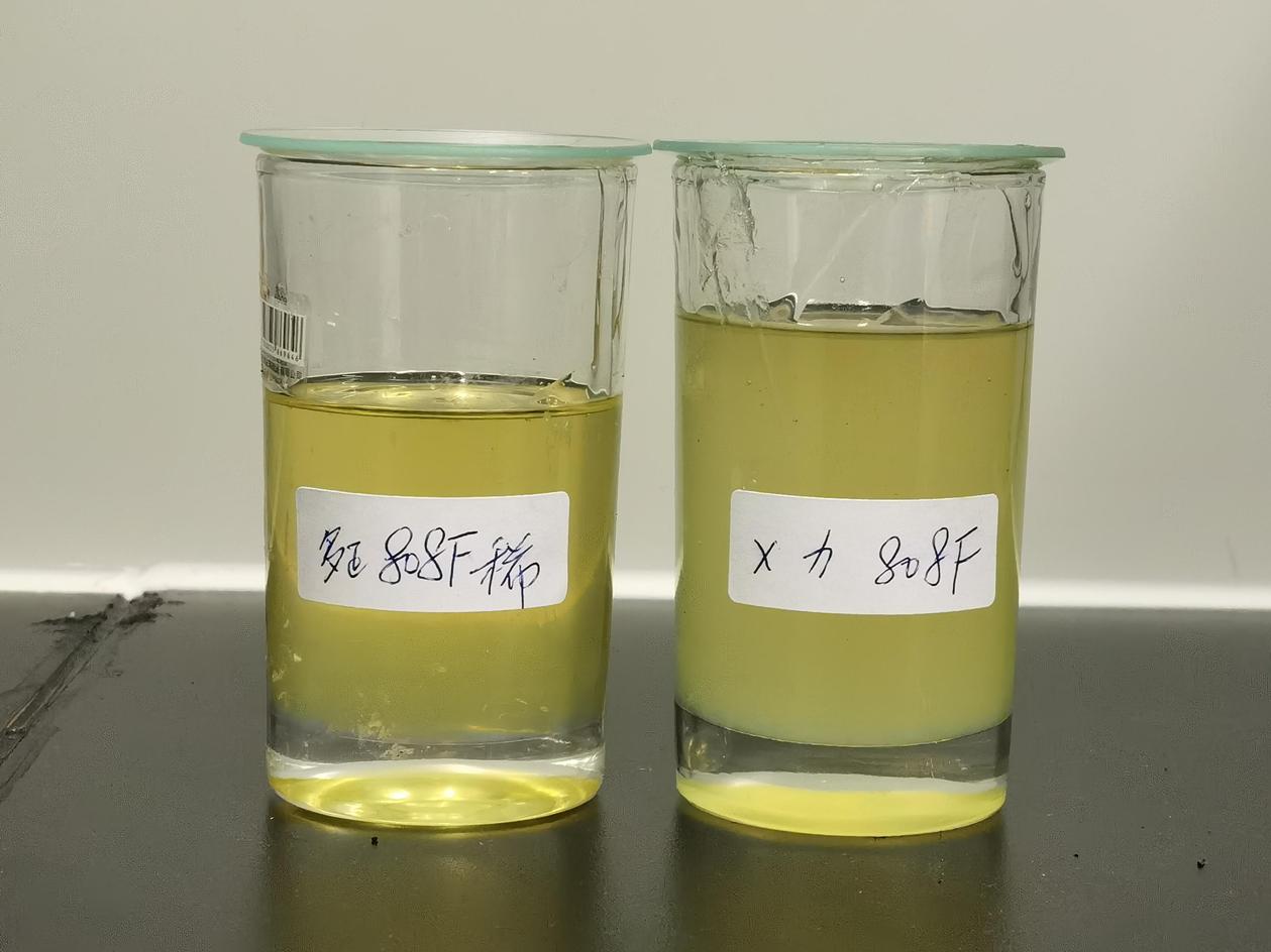 ※顏色:多正808F稀液體呈淺黃色透明狀,對淺色類產品尤為適用;某力808F呈淺黃色透明半霧狀,透明度不高。