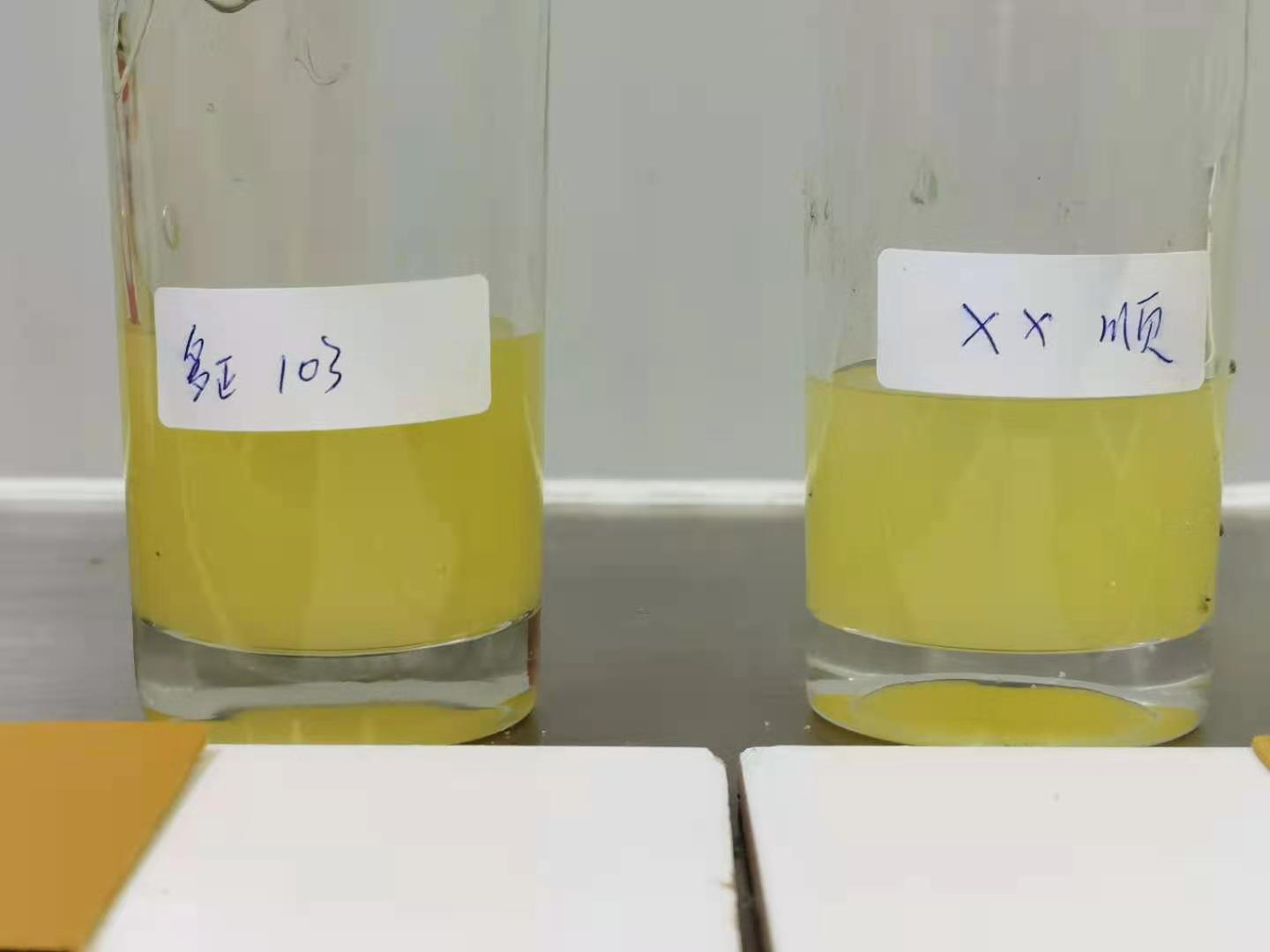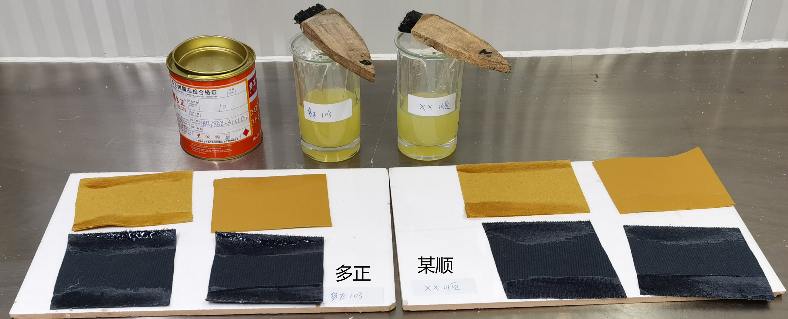 皮革膠粘劑多正樹(shù)脂103粉膠,采用進(jìn)口3R橡膠搭配科學(xué)環(huán)保技術(shù)研發(fā)而成,具有顏色淺、氣味小、涂刷性能好、粘力強(qiáng)等特點(diǎn),為了了解多正樹(shù)脂旗下產(chǎn)品在同行業(yè)中的應(yīng)用情況,公司相關(guān)技術(shù)人員找來(lái)了與103粉膠同類型的市場(chǎng)上××順103粉膠進(jìn)行PK對(duì)比測(cè)試。