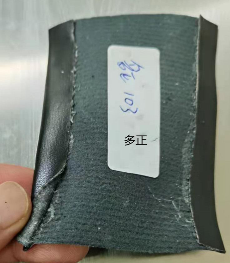 利用PU革絨面模擬工廠折邊防爆試驗(yàn),折邊貼合后進(jìn)行65℃烘箱干燥30min,觀察是否爆開(kāi)或鼓包,結(jié)果兩膠都沒(méi)有出現(xiàn)水爆開(kāi)或鼓包的情況,兩膠耐高溫性能基本滿足,但扯開(kāi)折好邊的位置會(huì)發(fā)現(xiàn),多正103粉膠折邊效果相對(duì)好點(diǎn)。