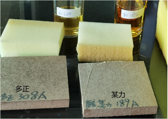※木板與海綿對貼試驗,分別使用某力和多正的沙發(fā)噴膠噴涂在木板單面上,海綿不上膠,在噴涂后干燥1-2min貼合效果最佳,由此可見兩者都能材破海綿,多正和某力的材破深度一樣厲害。