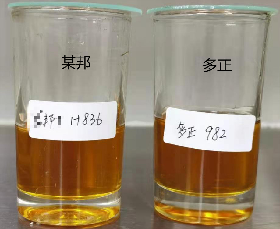 ※從玻璃杯直觀可見,多正982和某邦H836均為金黃色液體,顏色透亮。