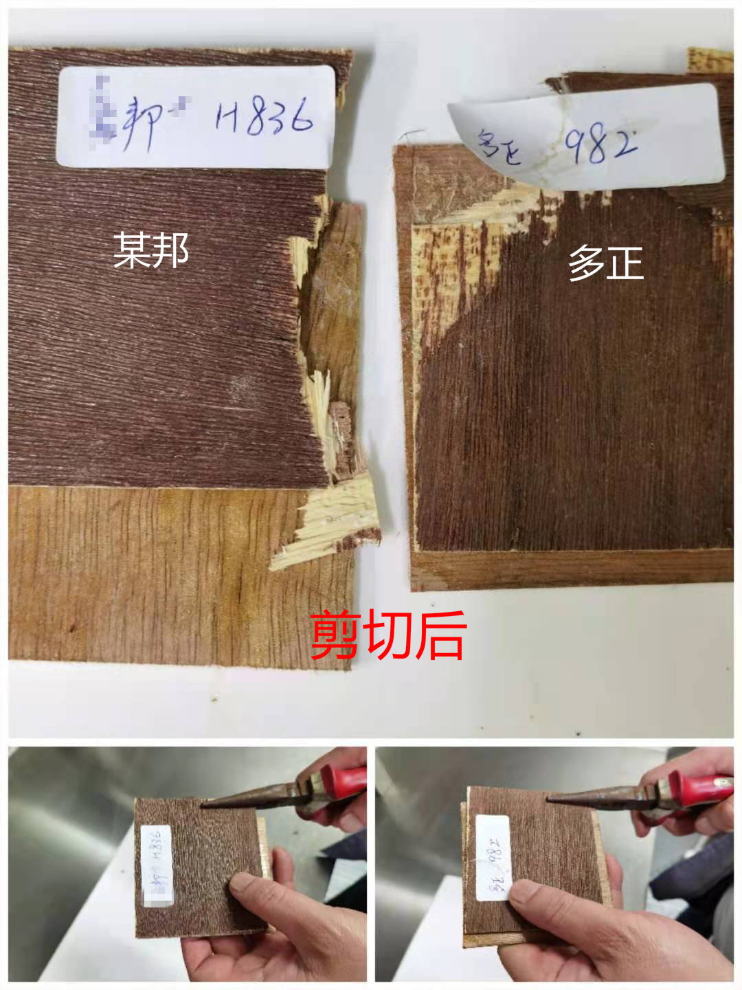 ※現(xiàn)場(chǎng)操作人員使用同一把剪刀對(duì)木板進(jìn)行剪切,剪切涂刷某邦的木板時(shí),剪切拉力為2.0MPa,輕松剪切,徒手可對(duì)木板進(jìn)行分離,粘性較弱;剪切多正木板時(shí),剪切拉力為2.4MPa,僅剪切小部分木板,徒手對(duì)木板分離不成功,整體性能而言,多正的粘結(jié)效果比某邦的要出色。